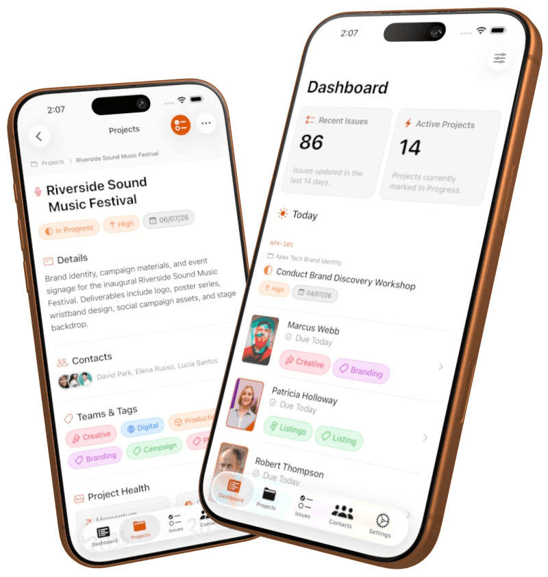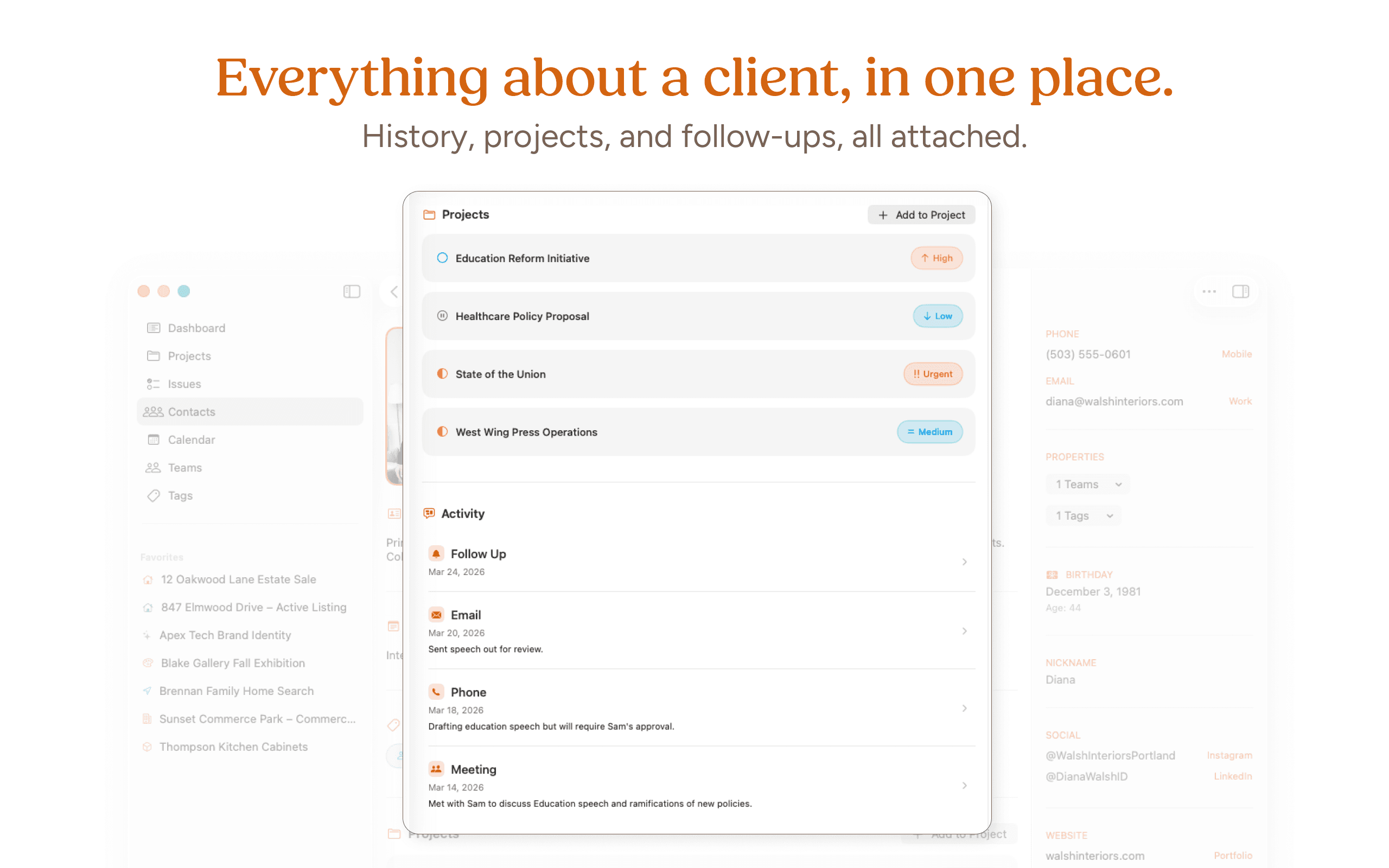 You're juggling three active clients and two proposals in progress. Before a check-in call, you open Clients. Last conversation, current project status, and the follow-up you set two weeks ago, all in one view. You're ready in 30 seconds.