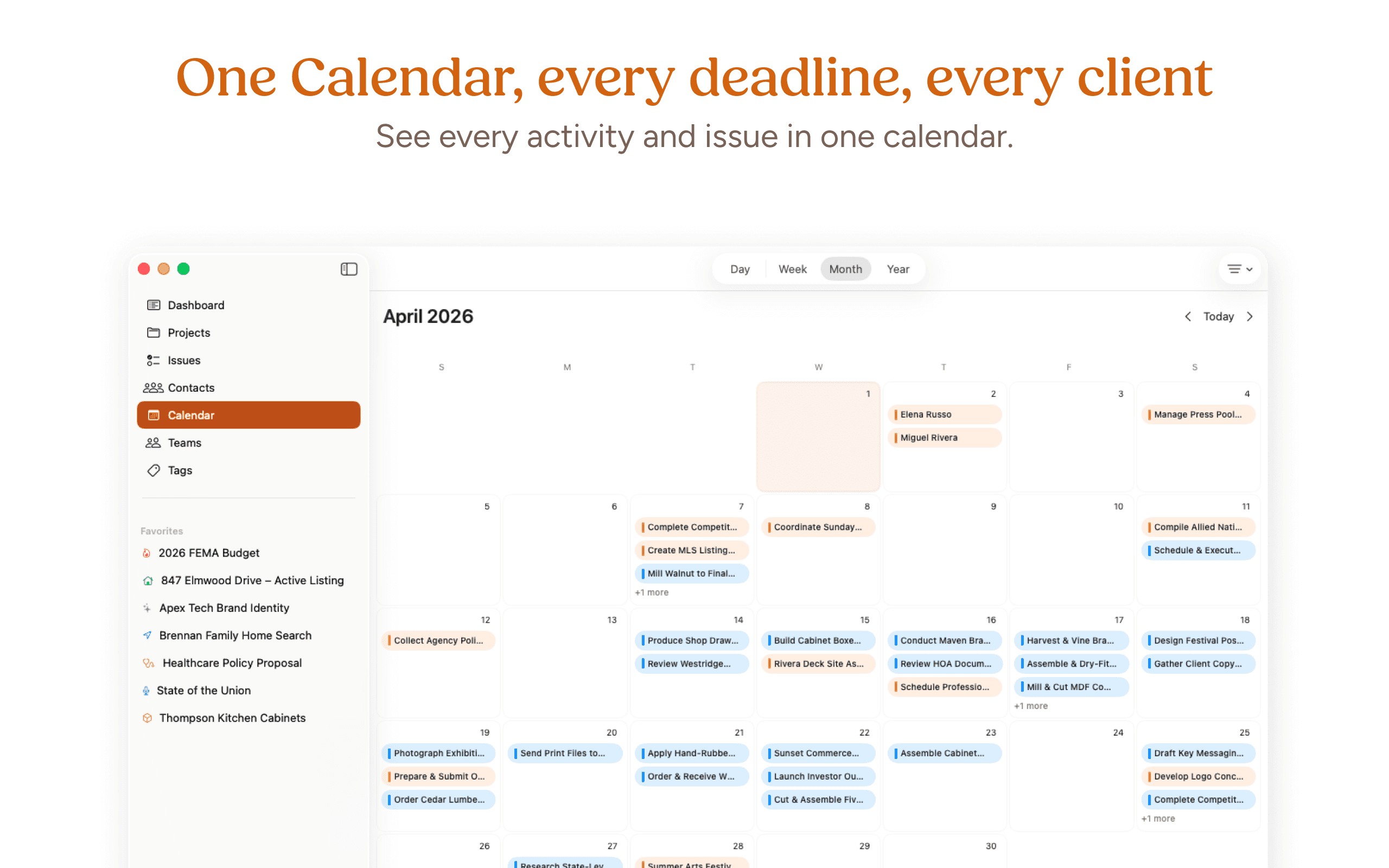 Use the Calendar to see every client interaction, project issue, and more at a glance. The last time you called, the last project due date - it's all on the calendar.