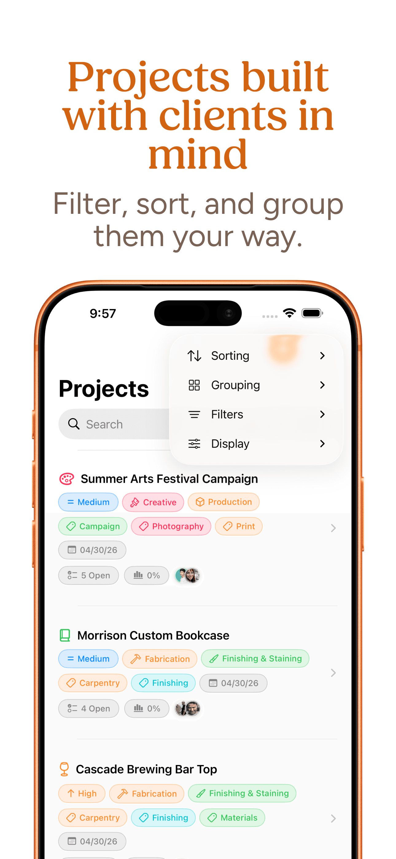Pin your most active projects and clients in the sidebar or filter. The projects and people you're working with right now are always one tap away.